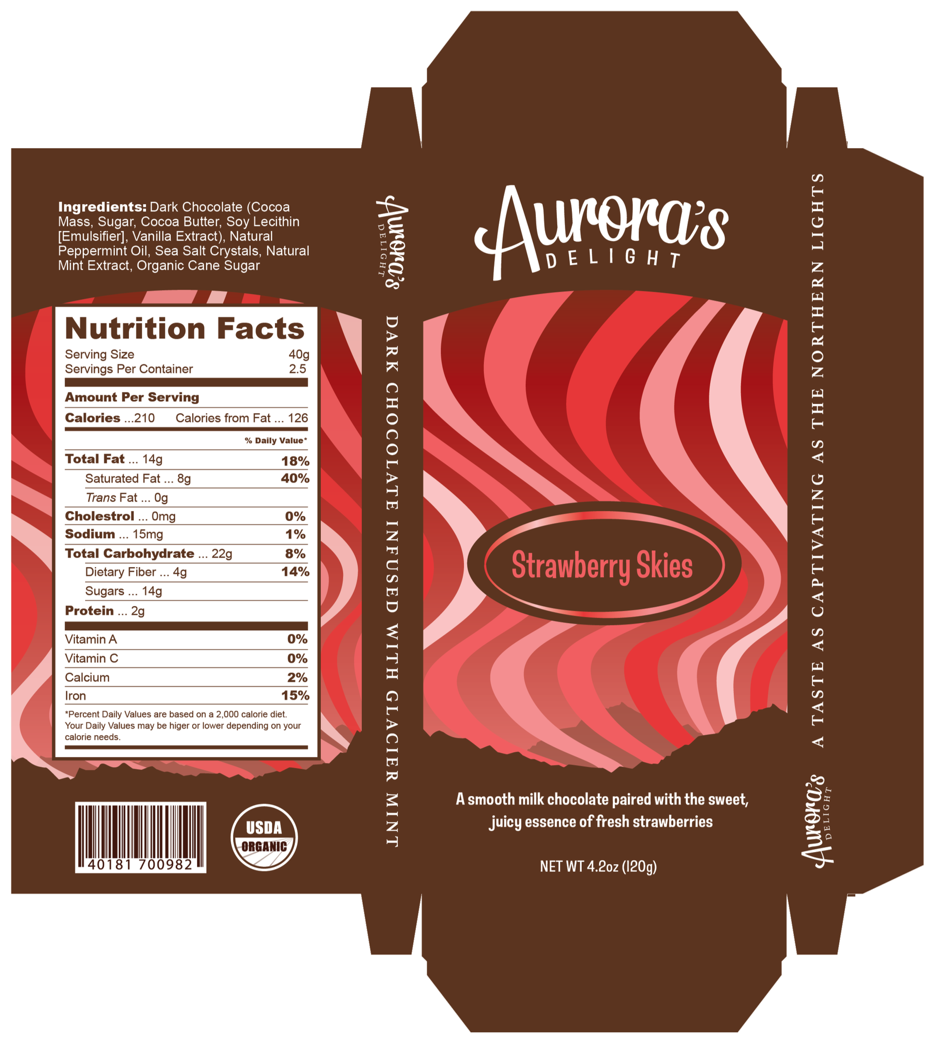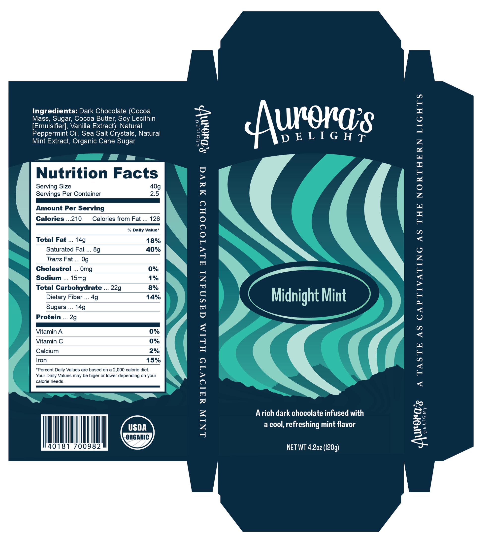 Aurora’s Delight is a premium chocolate brand inspired by the captivating beauty of the Northern Lights, where each bar delivers a magical balance of indulgence and freshness. The collection features three distinct flavors such as dark chocolate with mint, white chocolate with caramel, and milk chocolate with strawberries, each crafted to reflect a unique harmony of richness, brightness, and natural influence.